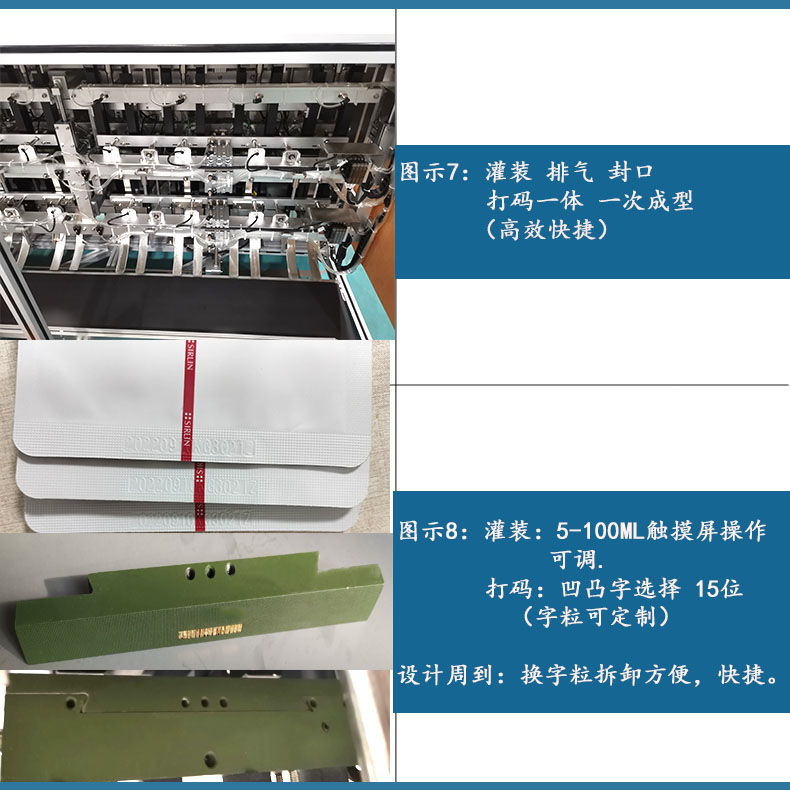 Automatic bag feeding, liquid filling, sealing, and finish bag out feeding; with auto counting function, no bag no fill, no bag no seal;