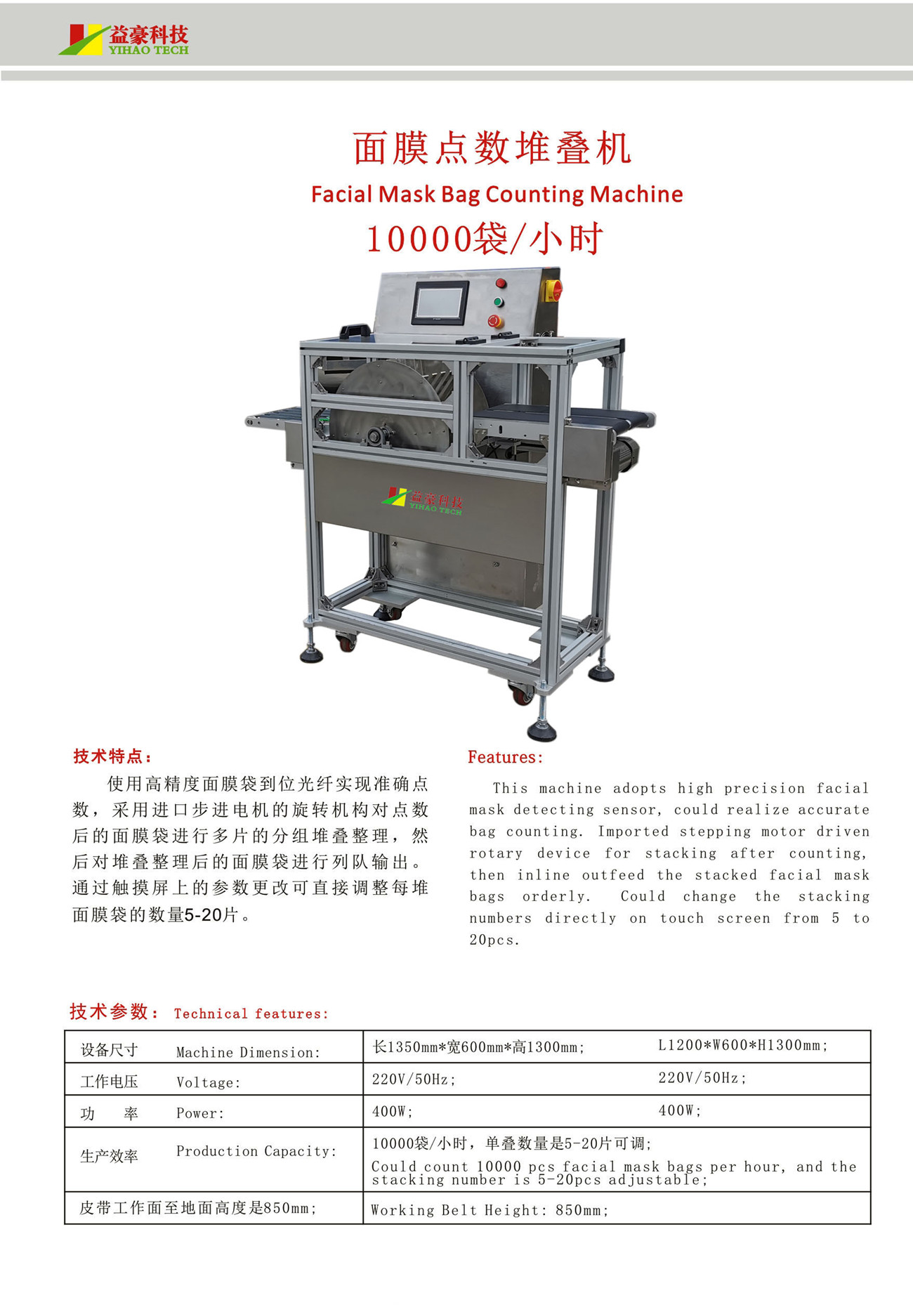 使用高精度面膜袋到位光纖實現(xiàn)準(zhǔn)確點數(shù),采用進(jìn)口步進(jìn)電機的旋轉(zhuǎn)機構(gòu)對點數(shù)后的面膜袋進(jìn)行多片的分組堆疊整理,然后對堆疊整理后的面膜袋進(jìn)行列隊輸出。通過觸摸屏上的參數(shù)更改可直接調(diào)整每堆面膜袋的數(shù)量5-20片。